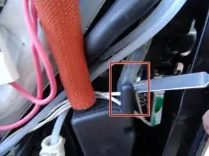 С помощью плоского инструмента отсоедините сливной шланг слева.