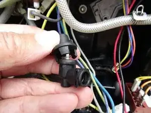 Аккуратно сдвиньте нижний выпускной клапан влево, чтобы вышел напорный шланг. Следите за уплотнительным кольцом. Оно либо застрянет в клапане, либо останется на конце шланга. Замените его новым при сборке.