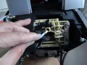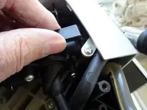 Опорная пластина верхнего поршня теперь свободна. Однако она плотно установлена, и извлечь её будет непросто. Действуйте терпеливо и аккуратно. Следите, чтобы не повредить шлейф, идущий к панели управления.