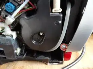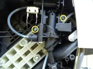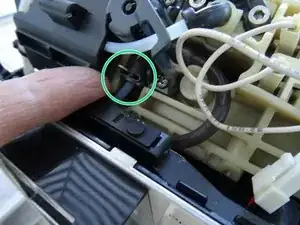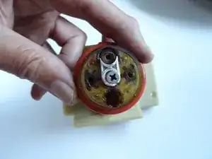 Поршень крепится к серой пластиковой детали с помощью маленького кольцевого фиксатора. Отведите плавкий предохранитель в сторону и надёжно уберите его.