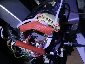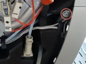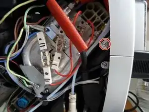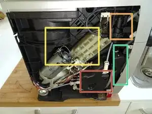 Если есть нагреватель чашек, отвинтите гайку SW7, к которой подключены два зелёно-жёлтых провода, и ослабьте её. Два коричневых провода на другой стороне можно оставить, если просто отвести крышку в сторону.