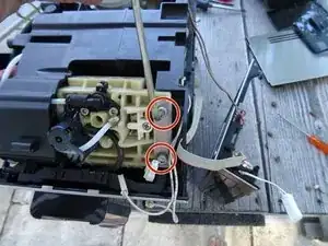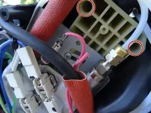 На верхнем поршне заварочного блока шесть соединений: три линии подачи горячей воды под давлением, одна линия отвода воды без давления, шланг к носику кофе и два провода к микропереключателю. Все соединения необходимо отключить.