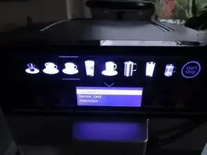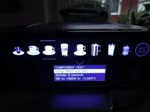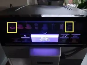Нажмите на поле "Меню", оно немного темнее. Появится меню настроек для языка, жесткости воды и т.д. Но это еще не сервисное меню.