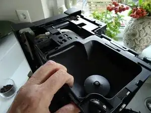 Отодвиньте бункер для зерен назад примерно на 1 см, затем снимите его, поднимая под углом назад. Убедитесь, что ось регулятора помола снялась. Контейнер всё ещё соединён с кабелем крышки отсека для порошка. Отсоединять его не нужно — просто положите весь узел на верхнюю часть машины.