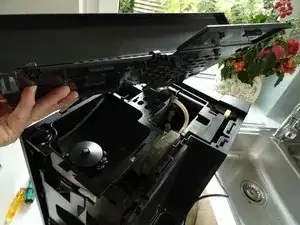 Верхняя крышка закреплена штыревыми защёлками в нескольких местах. Сначала её нужно отодвинуть назад примерно на 1 см, а затем снять вверх.