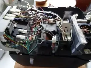 Взгляд внутрь открытого устройства. Термоблок скрыт под массой проводов и трубок.