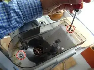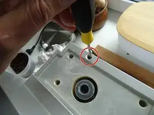 Удалите единственный винт Phillips на заднем крае верхней крышки под контейнером для кофейных зерен.