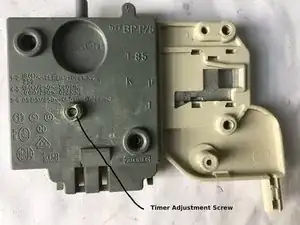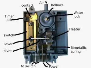 Когда переключатель срабатывает, электрические контакты замыкаются, отправляя сигнал остальной части машины, что можно включать. Срабатывание переключателя также перемещает черный замок таймера, который физически ограничивает механизм скольжения. (серебряный водяной замок также ограничивает этот механизм, но он работал нормально и не изменял