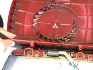 На задней стороне верхней панели с помощью отвертки Phillips #2 удалите два винта 12 мм, которые крепят верхнюю панель к петле.