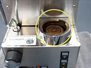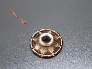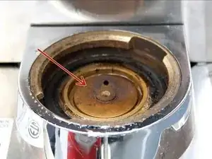 Вот латунный диск после извлечения. Замочите его в чистящем средстве для кофе с горячей водой примерно на 10 минут. Затем почистите обе стороны стальной щеткой. Удалите остатки кофе с диска.