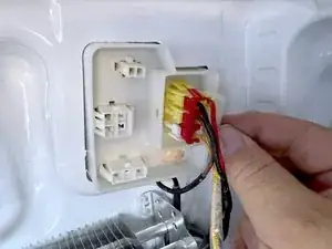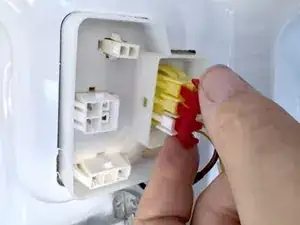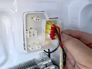 Возьмитесь за разъём льдогенератора (тот, что спереди), и сожмите фиксатор.