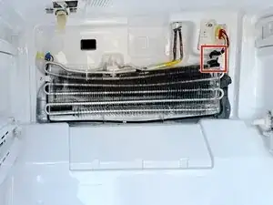 Термостат высокого предела установлен на кронштейне рядом с испарителем в морозильной камере, за панелью испарителя.