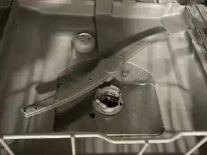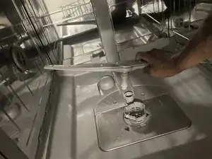 Откройте дверь посудомоечной машины, чтобы получить доступ к ее внутренней части, и найдите распылитель посудомоечной машины.