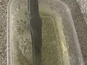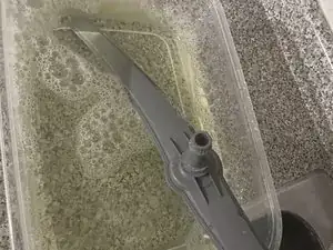 Поместите распылитель в большую миску с теплой мыльной водой, чтобы помочь размягчить загрязнения.
