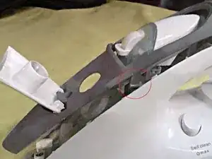 Отцепите верхнюю часть ручки от передней стороны (защелки обведены на фотографии). Будьте осторожны, чтобы не сломать (как мы) паровой сопло!