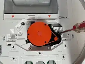 Используйте лопатку, чтобы отсоединить пластиковый трос от мотора, соединяющего его с лазером.