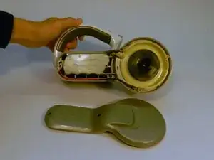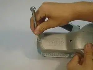 Поверните пылесос так, чтобы была видна фирменная эмблема. Затем снимите два винта на корпусе пылесоса.