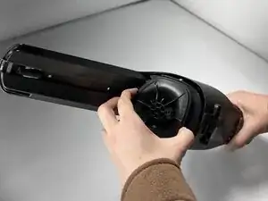Проведите инструментом iFixit Opening Tool под кожухом вдоль корпуса пылесоса, пока оболочка не будет снята, начиная примерно от порта для насадок и двигаясь в сторону порта зарядки.
