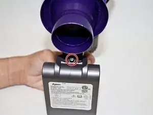 Найдите винт 10 мм сбоку аккумуляторной батареи, ближайший к фиолетовому циклонному устройству пылесоса.
