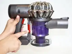 Снова нажмите красный рычаг вниз, одновременно вытягивая прозрачный контейнер от основного корпуса пылесоса Dyson.