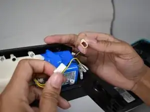 Отсоедините провода, удерживающие аккумуляторную сборку от основного корпуса, нажав на зажим, удерживающий разъем вместе.