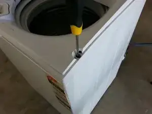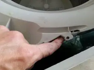 Просто снимите пластиковые заглушки винтов, затем открутите два передних винта. Заметьте, нет необходимости полностью снимать переднюю панель — достаточно откинуть её назад на петле, чтобы получить доступ. Будьте осторожны с шлангами и электрическими проводами на задней стороне панели.
