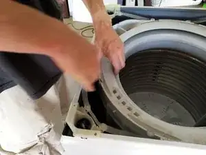 Поддержите край барабана левой рукой. Снимайте и заменяйте стойки по одной. Вы не хотите, чтобы вес барабана опирался на двигатель и насос снизу — можно что-то повредить. Меняя стоики по одной, остальные три помогают держать вес барабана.