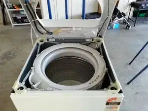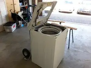 Я использовал старую вешалку, чтобы подвесить пластиковую крышку в стороне, зацепив её за тележку, которой я передвигал стиральную машину. Это даёт доступ к 4 резиновым ремням и 4 амортизаторам.