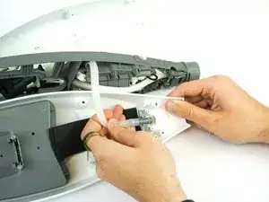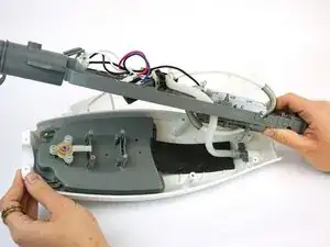 Снять серую переднюю панель защёлкиванием, чтобы получить доступ к панели управления и винтам, необходимым для открытия корпуса швабры.