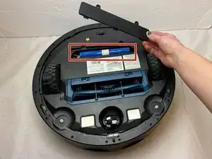 Поднимите батарею из пылесоса, чтобы получить доступ к соединенному белому язычку.