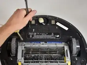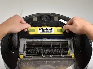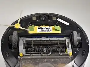 Переверните Roomba так, чтобы колеса смотрели вверх, а контейнер для пыли был ближе к вам.