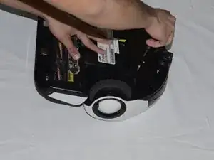 Нажмите на эту планку внутрь белой коробки и потяните провода вверх. Это отсоединит провода от белой коробки, что позволит полностью извлечь батарею.