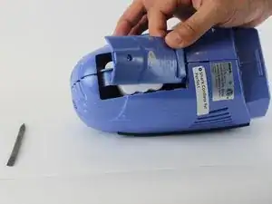 Снимите контейнер для пыли, затем открутите винт 7.5 мм (с битой PH2) с крышки батареи.