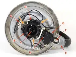 D: Термостат. Это небольшое металлическое кольцо, наполовину скрытое крышкой переключателя.