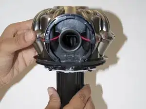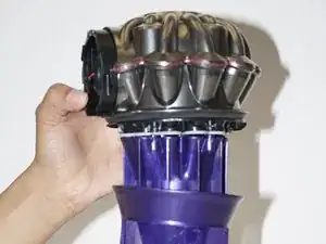 Потяните вниз чёрную трубчатую часть серебристого корпуса циклона, чтобы снять её с циклона Dyson.