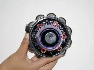 Отверткой T9 отвинтите пять винтов длиной 14 мм по краю корпуса циклона.