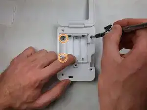 С помощью отвертки Phillips выверните два серебристых винта длиной 5 мм. Винты расположены на левой стороне внутренней крышки.