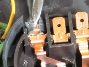 Отсоедините провод от нагревательного элемента, сначала сдвинув защёлку металлической лопаткой, затем вытолкнув её наружу.