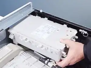 Нажмите на кнопку "Нажмите", чтобы отключить зажимы, удерживающие ящик для моющих средств.