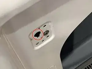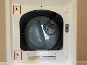 Стоя перед отверстием сушильной машины, найдите отверстия для крепления петель и отметьте, на какой они стороне. На этом фото они находятся слева от отверстия.