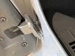На нижней пластине рамки дверцы наклейка закрывает неиспользуемую сторону запорного рычага. Подденьте наклейку плоской отверткой, чтобы снять её.