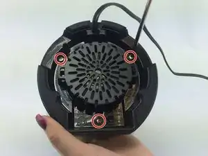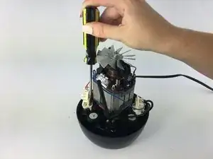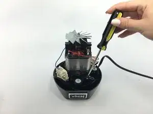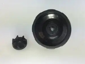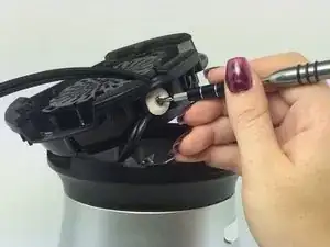 Удерживая вентилятор за серебристый элемент с помощью полотенца, поверните вправо маленькое чёрное резиновое колесо, прикреплённое к верхней части основания блендера. Это позволит снять колесо для замены.