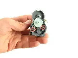 После выкручивания винта снимите верхнюю крышку корпуса мотора. Под ней вы увидите белую шестерню с двумя винтами рядом.