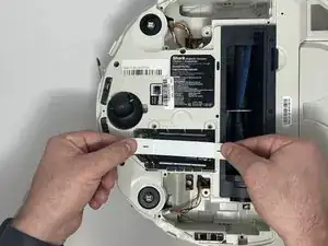 Используя две бумажные вкладки по обеим сторонам батареи, сдвиньте её вверх и выньте из робота.