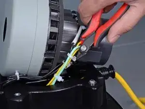 С помощью кусачек по проводу или ножниц разрежьте и удалите стяжку, зажатую вокруг чёрного, жёлтого и зелёного проводов двигателя.