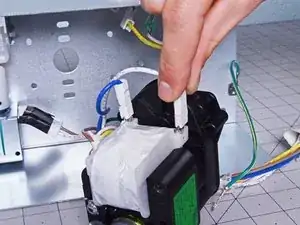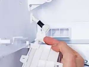 Потяните узел ледогенератора в сторону правого края холодильника, чтобы вывести его из посадочного места в шасси.