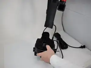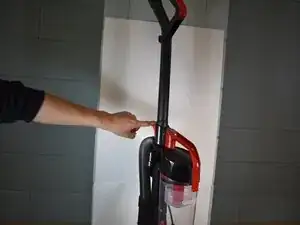 Поставьте пылесос вертикально и нажмите на защёлку на задней стороне стойки, чтобы снять ручку с пылесоса.