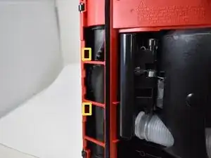 Используйте инструмент для вскрытия или отвёртку с плоским жалом, чтобы отсоединить два фиксатора, удерживающих крышку барабана щётки.