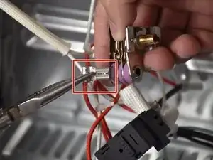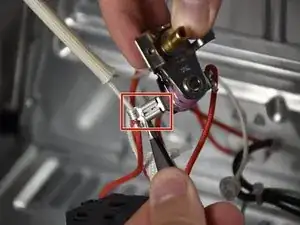 Нажмите плоскогубцами с узкими губками на металлическую защелку разъема регулятора нагрева духовки и потяните наружу для снятия разъема.