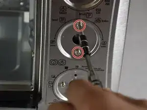 Удалите два винта длиной 7,5 мм, которые крепят элементы управления тостером к передней панели, с помощью отвертки Phillips №2.